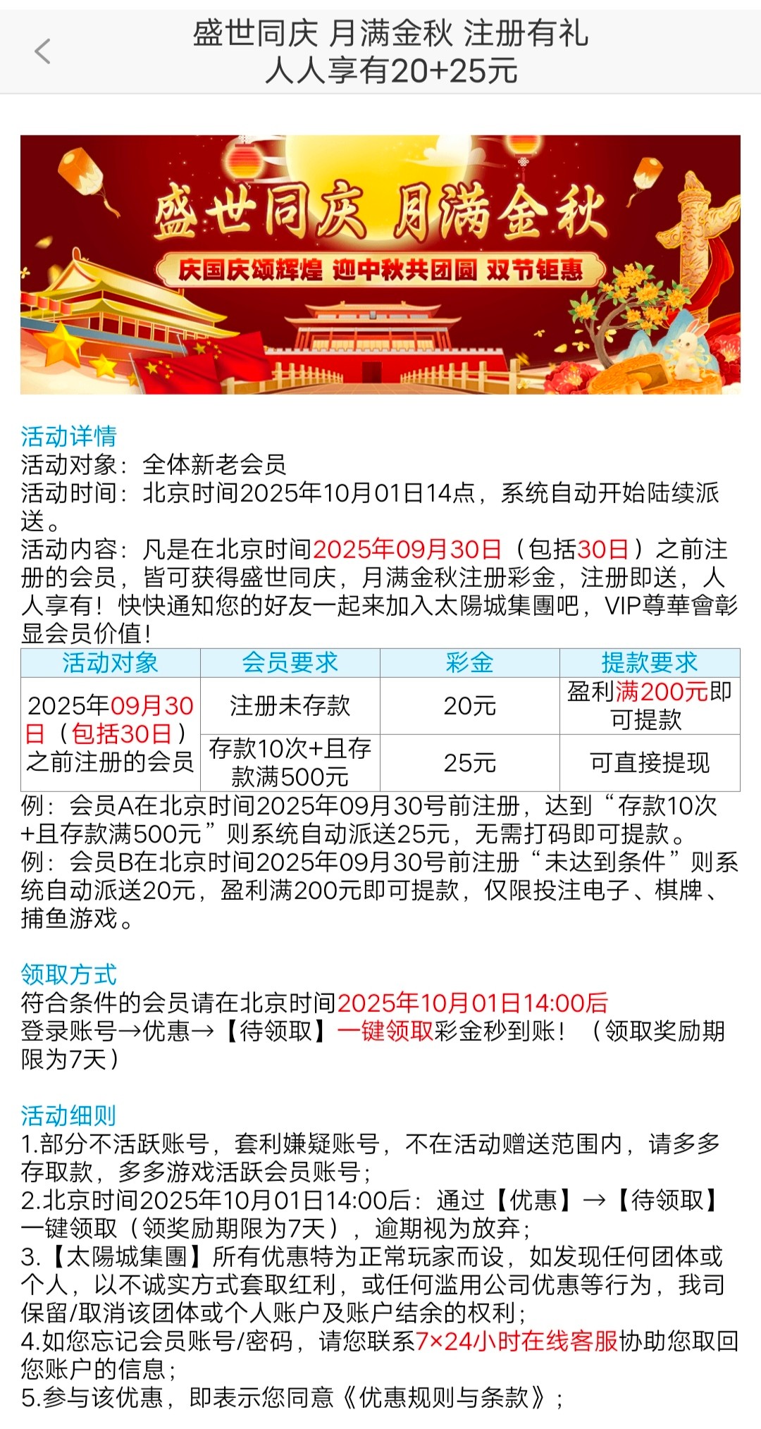 9月30日之前注册,国庆回馈20+25。